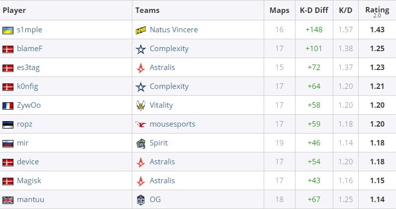 S1mple оторвался от ближайшего преследователя в лице blameF на 0.18 пунктов рейтинга 2.0 от HLTV. Главные конкуренты Александра за звание лучшего игрока прошлого года – ZywOo и device расположились на 5-ой и 8-ой строчках данного рейтинга. В топ-10 также вошёл ещё 1 игрок из СНГ – Николай «mir» Битюков из Team Spirit.
