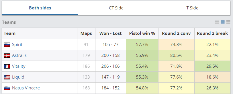 Spirit сыграли 91 карту за последние 12 месяцев и выиграли 105 пистолеток, проиграв 77. Винрейт составил 57.7%. В топ-5 команд по данному показателю за 2020 год также вошли Astralis (55.9%), Team Vitality (55.4%), Liquid (55.3%) и Natus Vincere (54.8%).