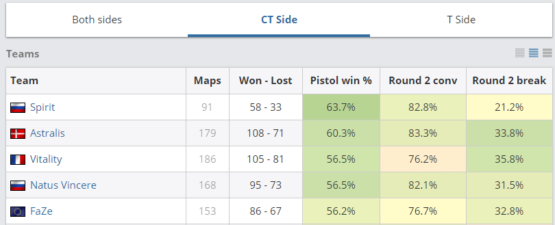 При этом больше всего пистолетных раундов Team Spirit выиграли за сторону защиты – 63.7%.