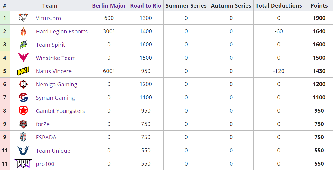Всего в рамках отборов на мейджор пройдут три квалификации. Также учитывается выступление команды на прошлом берлинском мейджоре. Теперь в итоговой таблице отборов на мейджор Virtus.pro занимают первую позицию, имея в активе 1900 очков, у Team Spirit — 1640. А вот сильнейшая команда региона согласно рейтинга hltv.org Natus Vincere находится на пятом месте с 1430 очками. Всего на мейджор в СНГ-регионе попадут пять команд. Следующие два отбора пройдут летом и осенью, поэтому шансы попасть на мейджор есть у всех.