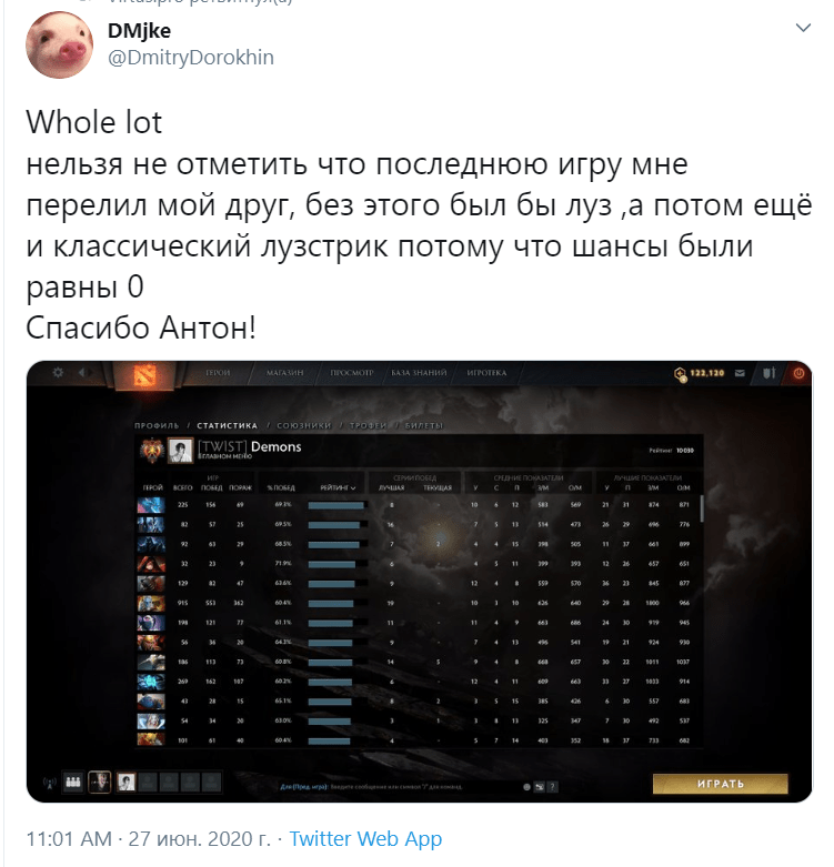 О своём достижение Дмитрий рассказал у себя в Twitter. По его словам, последнюю игру до заветных 10 тысяч ему намеренно слил друг.