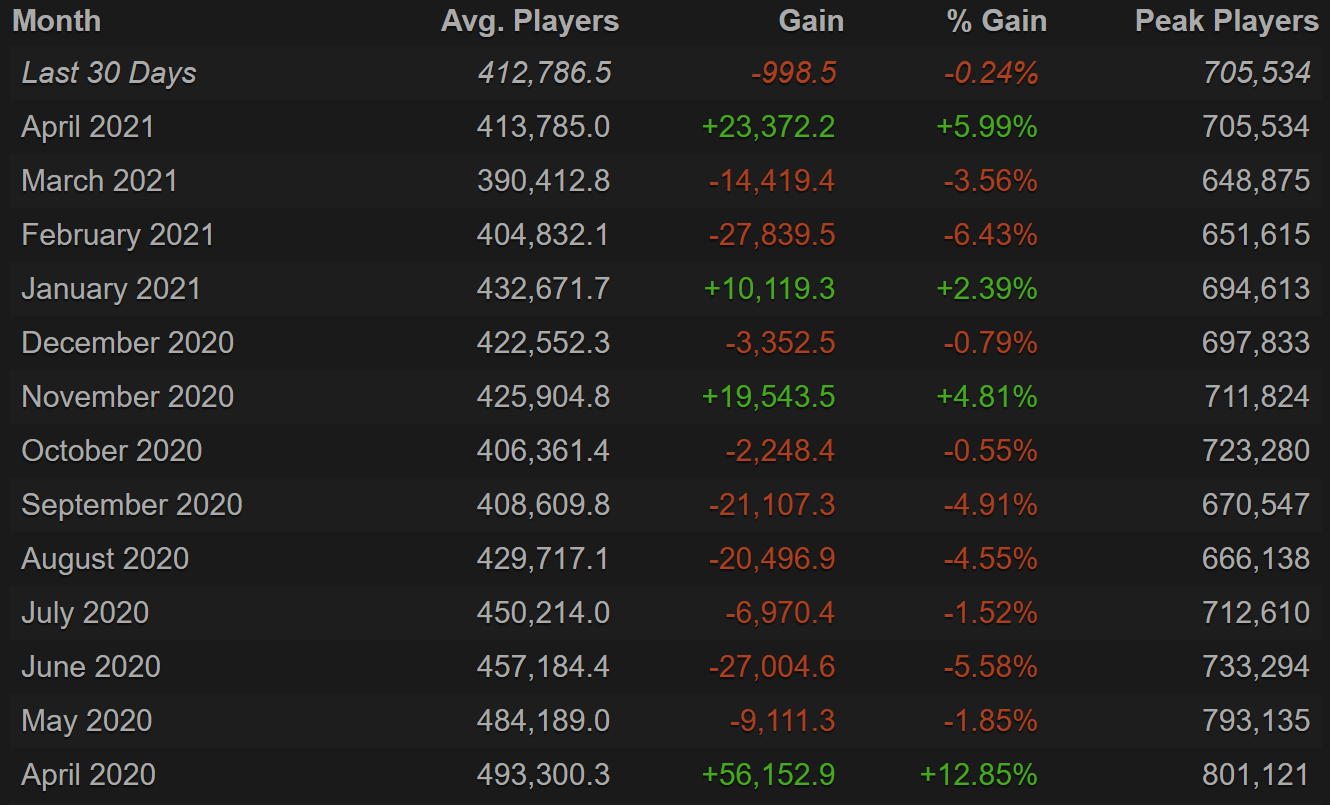 По сравнению с мартом средний онлайн Dota 2 в апреле вырос на 23 тысячи игроков (на 6%), тем самым вновь преодолев порог в 400 тысяч пользователей. Пиковый онлайн также заметно вырос — с 648 до 705 тысяч игроков, став самым большим в 2021 году.