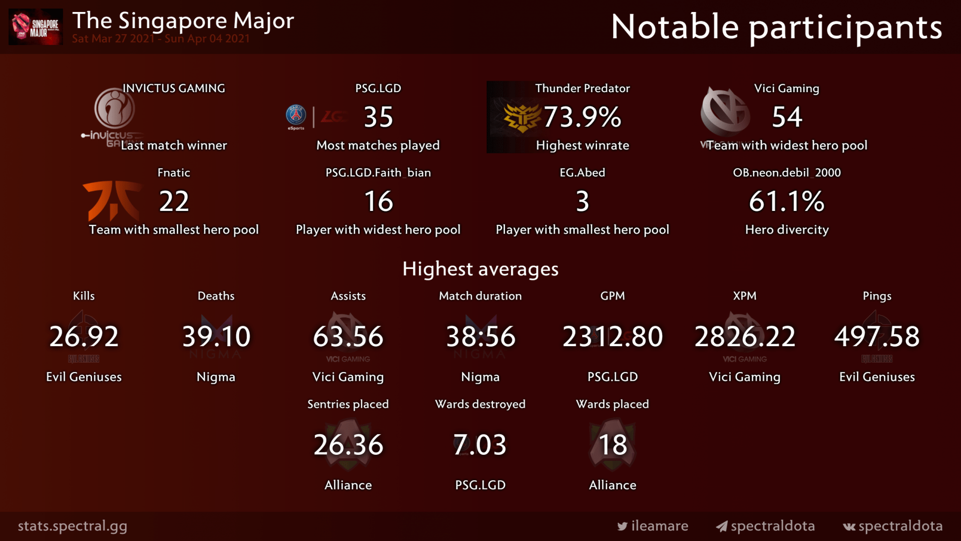 По данным, которые в своем твиттере представил аналитик статистического портала Spectral.gg, перуанская команда Thunder Predator хоть и не смогла пройти дальше топ-6, но заняла первое место по винрейту на Singapore Major. Их процент побед составил 73.9%.