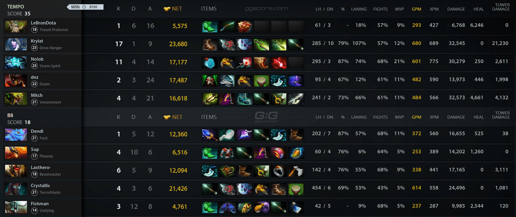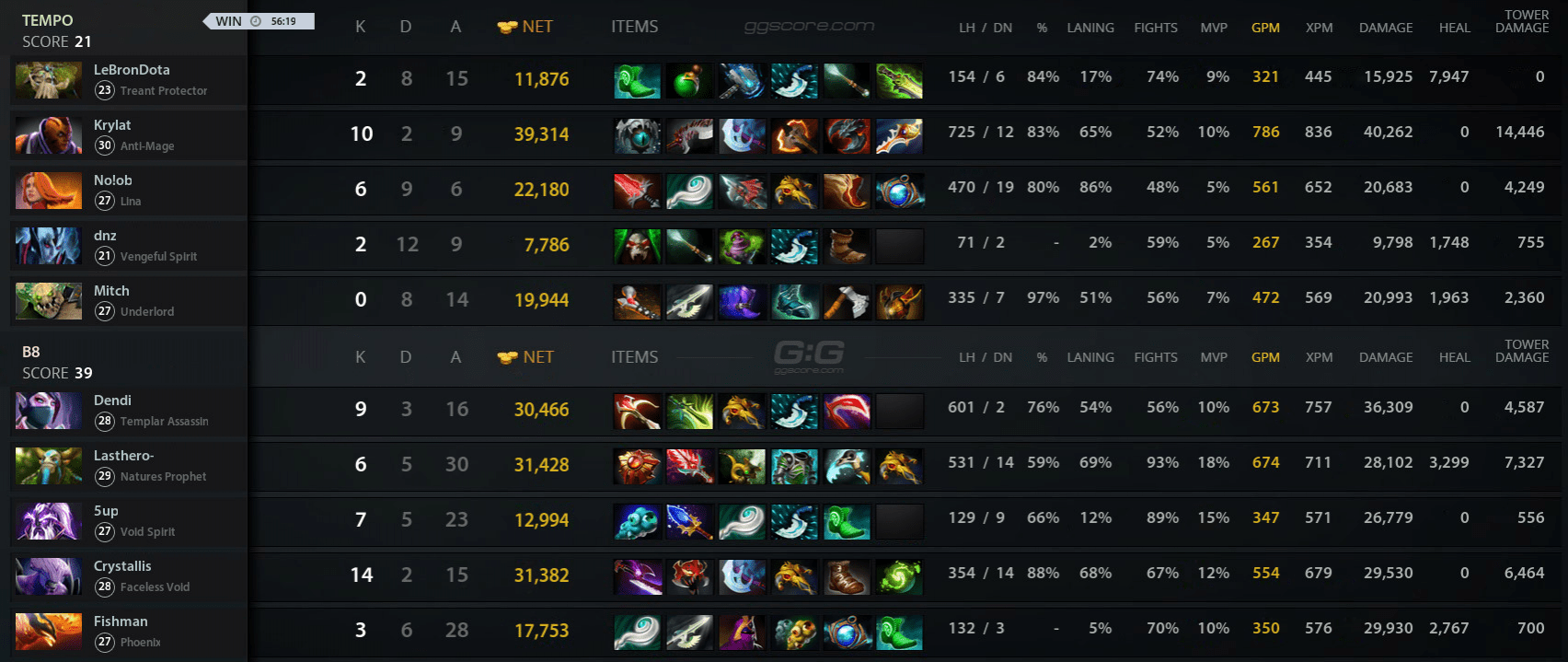 Противостояние закончилось со счётом 0:2 в пользу TEMPO. Наибольший интерес вызвала первая карта данной встречи. B8 имели преимущество в 45 тысяч по золоту и 50 тысяч по опыту, однако, проиграв всего одну драку, несколько героев оказались без байбека, и команда лишилась трона.