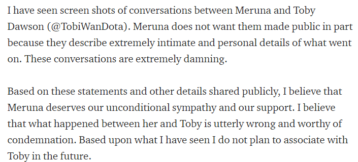 Основываясь на этом и других деталях, обнародованных ранее, я убежден, что Meruna заслуживает нашего безоговорочного сочувствия и поддержки. Я считаю произошедшее между ней и Тоби абсолютно неправильным и заслуживающим осуждения.