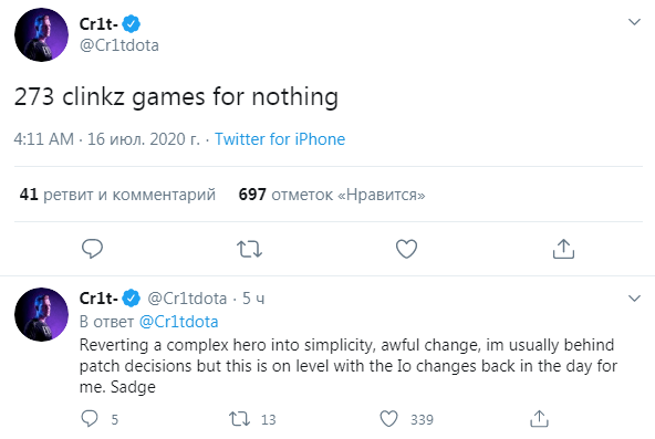 Игрок команды Evil Geniuses Андреас Франк «Cr1t-» Нильсен на своей странице в Twitter высказался по поводу изменения Clinkz в новом патче 7.27b.