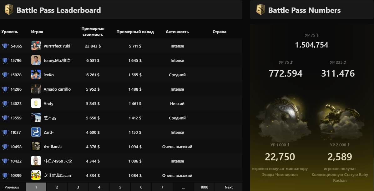 Портал stratz.com опубликовал статистику Battle Pass и прокачки компендиума среди всех владельцев компендиума.