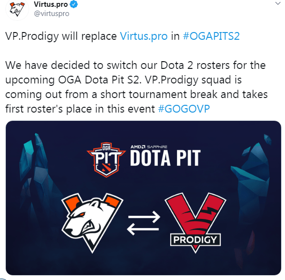 Организация Virtus.pro отправит на турнир OGA Dota PIT Season 2 состав VP.Prodigy вместо основного. Об этом она заявила в Twitter.