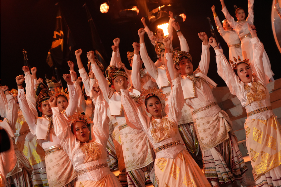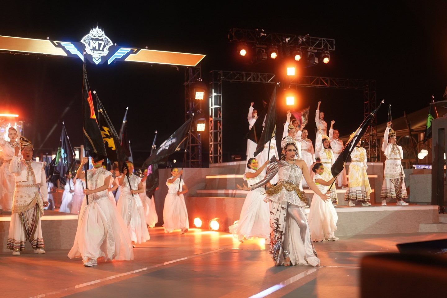 Следующим на сцене стал номер Voices of M7 — хоровое исполнение музыкального трека M7 под названием Sizzle. Его торжественное звучание задало сакральный, почти ритуальный тон выступлению. Кстати, в нем были задействованы не только музыканты, но и косплееры. В костюме персонажа Гатоткача — героя, которого создавали, вдохновившись индонезийским фольклерным воином, — они выносили флаги всех команд на сцену.