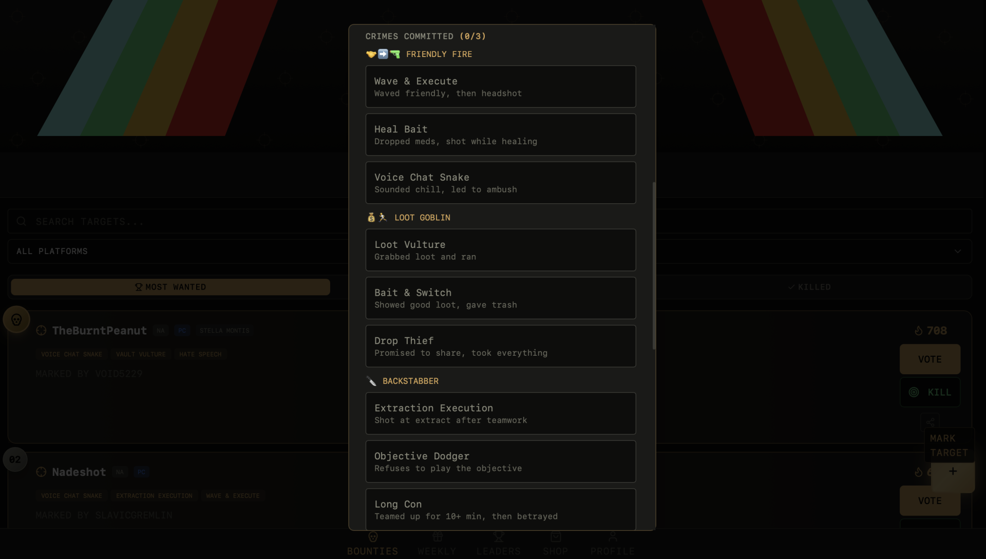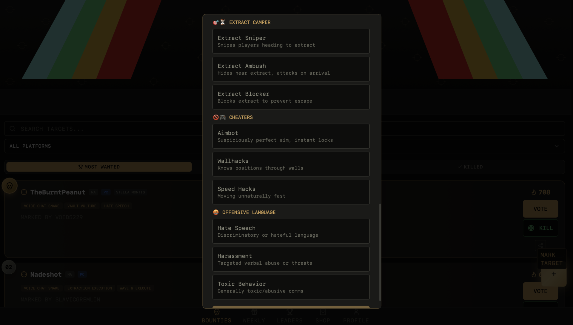 Другие секции отведены для наиболее разыскиваемых (за неделю) и устраненных игроков. Последняя предназначена для мерча — это своеобразный способ поддержки администрации сайта, доход за который, по всей видимости, покрывает расходы на хост.