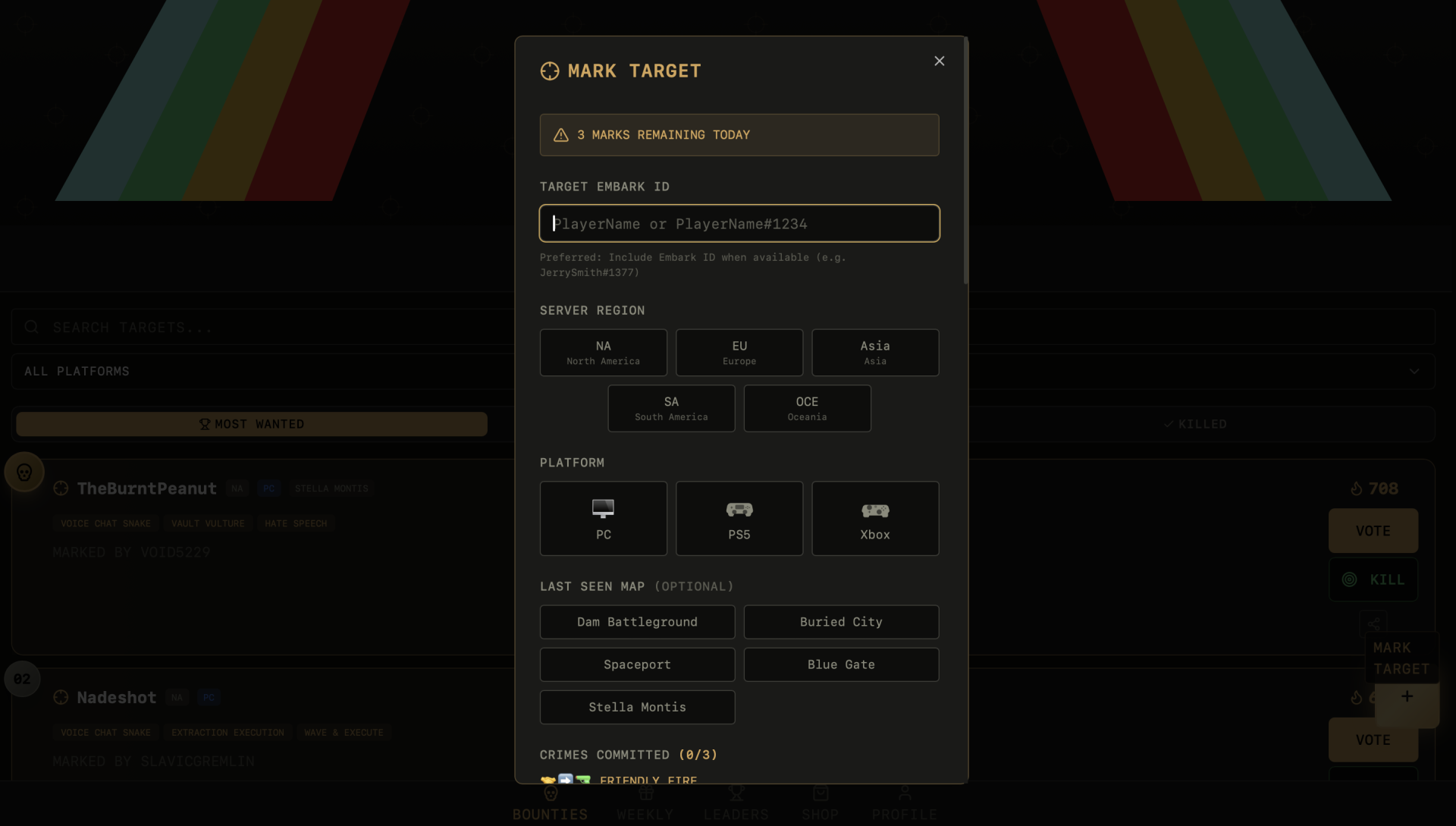 Рейдеры создали специализированный сайт, на котором каждый зарегистрированный пользователь может взять или заказать цель для охоты. Он получил название Speranza Bounties или «Охотники за головами Сперанзы». Выглядит веб-сайт достаточно просто и лаконично: