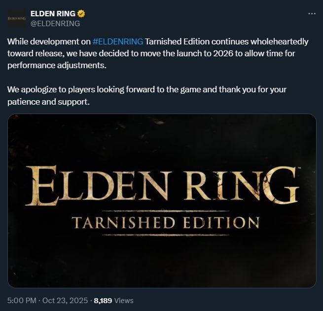 Студия FromSoftware объявила, что релиз Elden Ring Tarnished Edition для Nintendo Switch 2 не состоится в обозначенные сроки. Изначально проект должен был выйти в конце 2025-го, но теперь релиз отложили до 2026 года. Точной даты все еще нет.