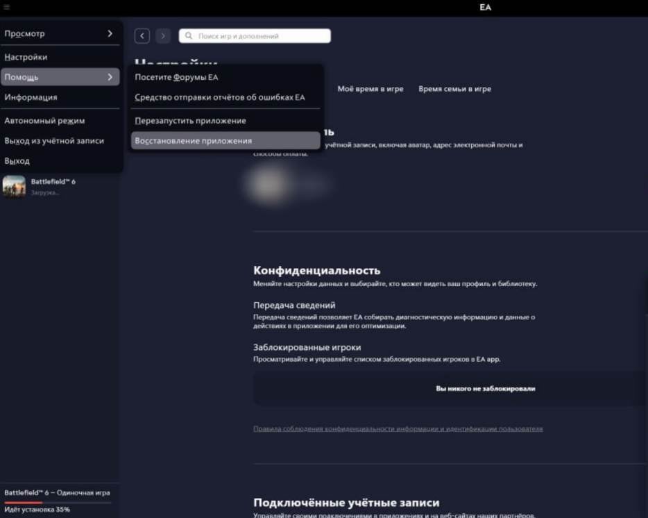 Перейдите в EA App на ПК и выберите три линии вверху над главной страницей, затем нажмите «Помощь» и «Восстановление приложения». Некоторым это помогло.