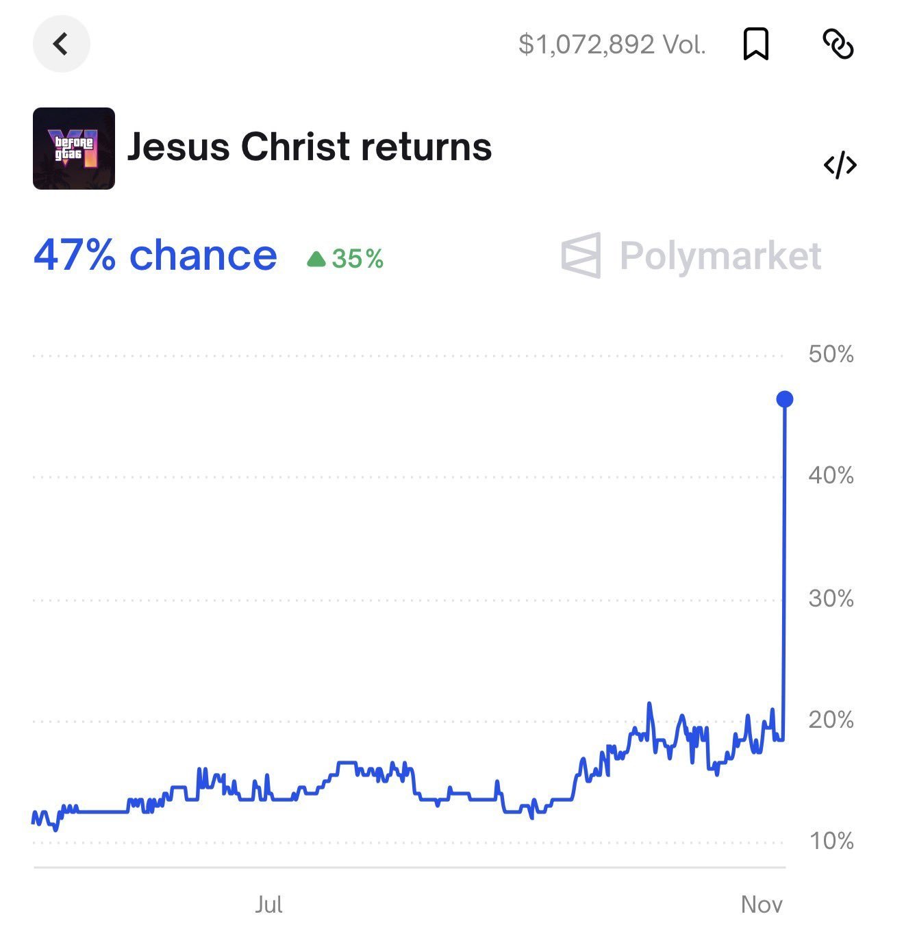 Иисус Христос вернётся в наш мир раньше выхода GTA 6 — с вероятностью 47%. Да, вы все правильно прочитали. Это не пророчество, а котировка на Polymarket — площадке, где пользователи делают ставки не на спорт, а на самые безумные события: от выборов президента США до апокалипсиса.