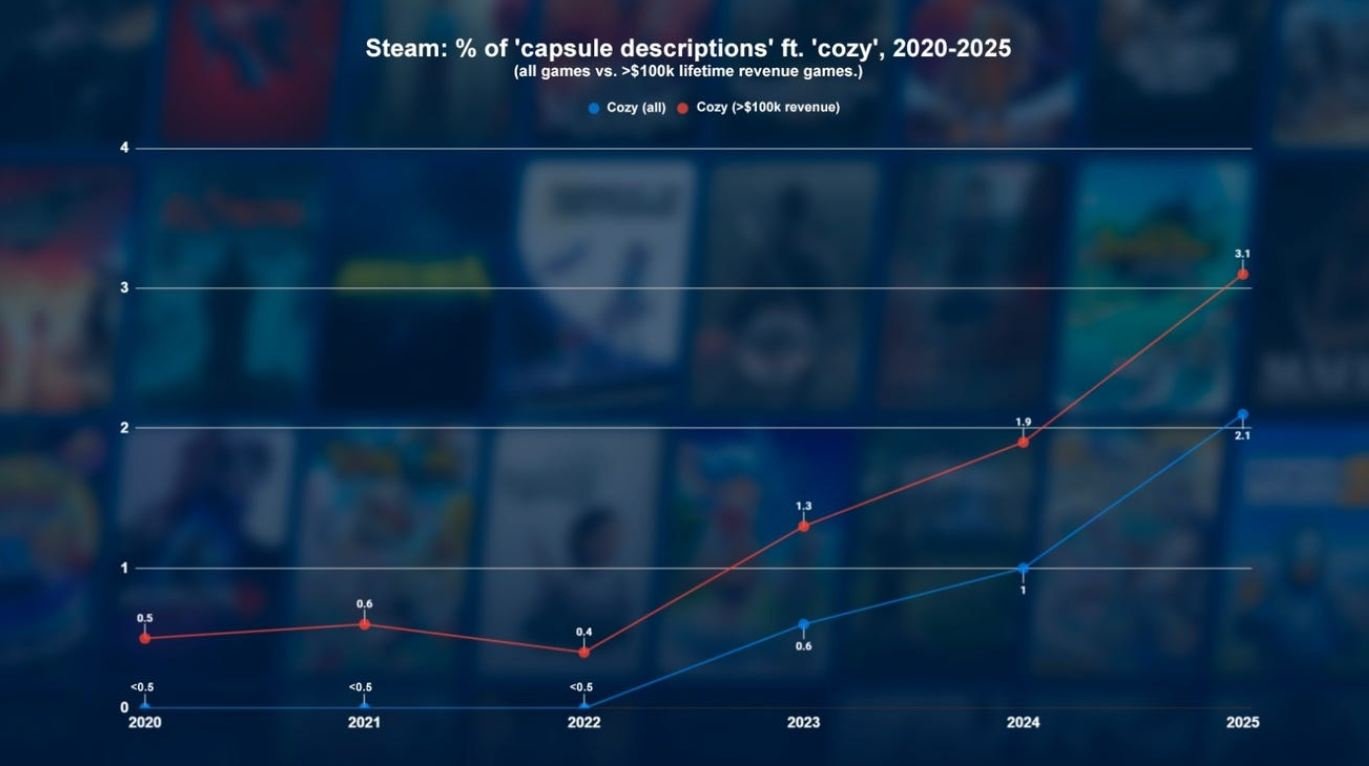 Недавно аналитической компании GameDiscoverCo удалось выявить ключевой тренд Steam за последние лет пять. Было опубликовано исследование, по данным которого оказалось, что в описаниях игр все чаще встречается слово «cozy», означающее «уютный», «комфортный», «милый» — за промежуток с 2022 по 2025 показатель вырос с 0,4% до 3,1%, дав аналитикам право заявить, что уютным играм удалось укорениться на площадке.