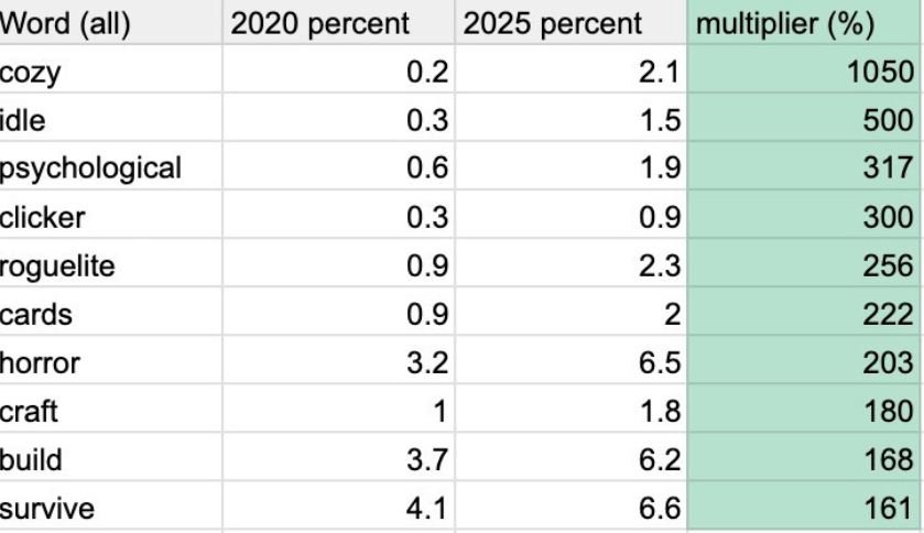 Среди заметных тенденций — рост популярности слова «factory» (+325%). Это показывает интерес к менеджмент- и производственным симуляторам. Также значительно возросло количество упоминаний слова «adult» (+314%). В описаниях коммерчески успешных проектов чаще встречаются слова «expand» и «shop».