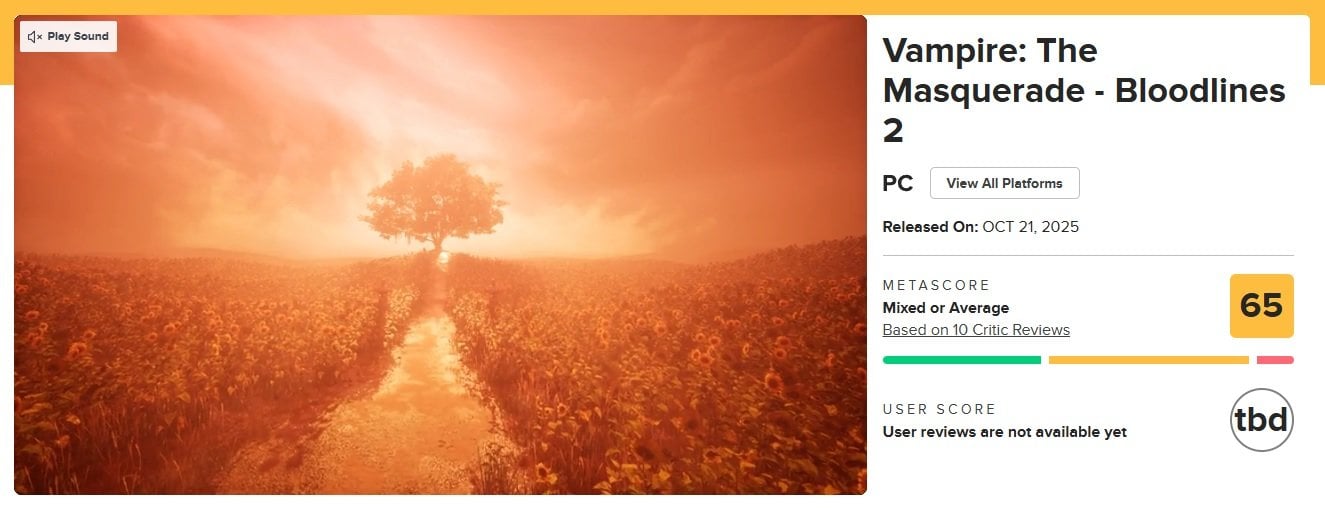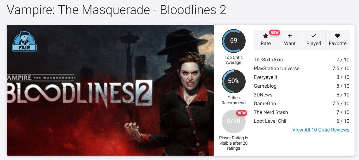 Западные СМИ начали публиковать первые отзывы на вампирскую ролевую игру Vampire: The Masquerade - Bloodlines 2. На агрегаторе Metacritic средняя оценка составила всего 65 баллов из 100. На Opencritic ситуация не лучше — 69 баллов и 50% рекомендаций.