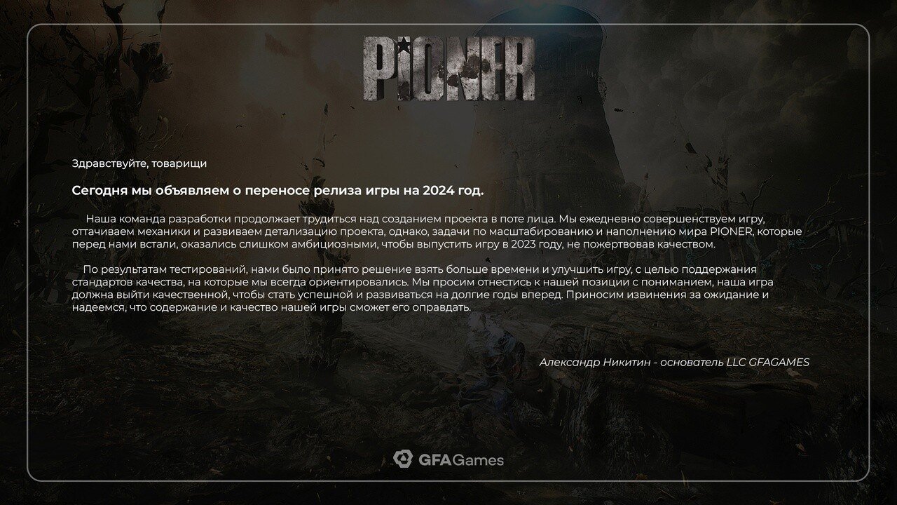 Российская студия GFA Games объявила о переносе релиза отечественного MMO-шутера PIONER на 2024 год. Ожидалось, что бета-версия игры выйдет до конца 2023 года, но результат тестирования показал, что проект еще требует доработок.