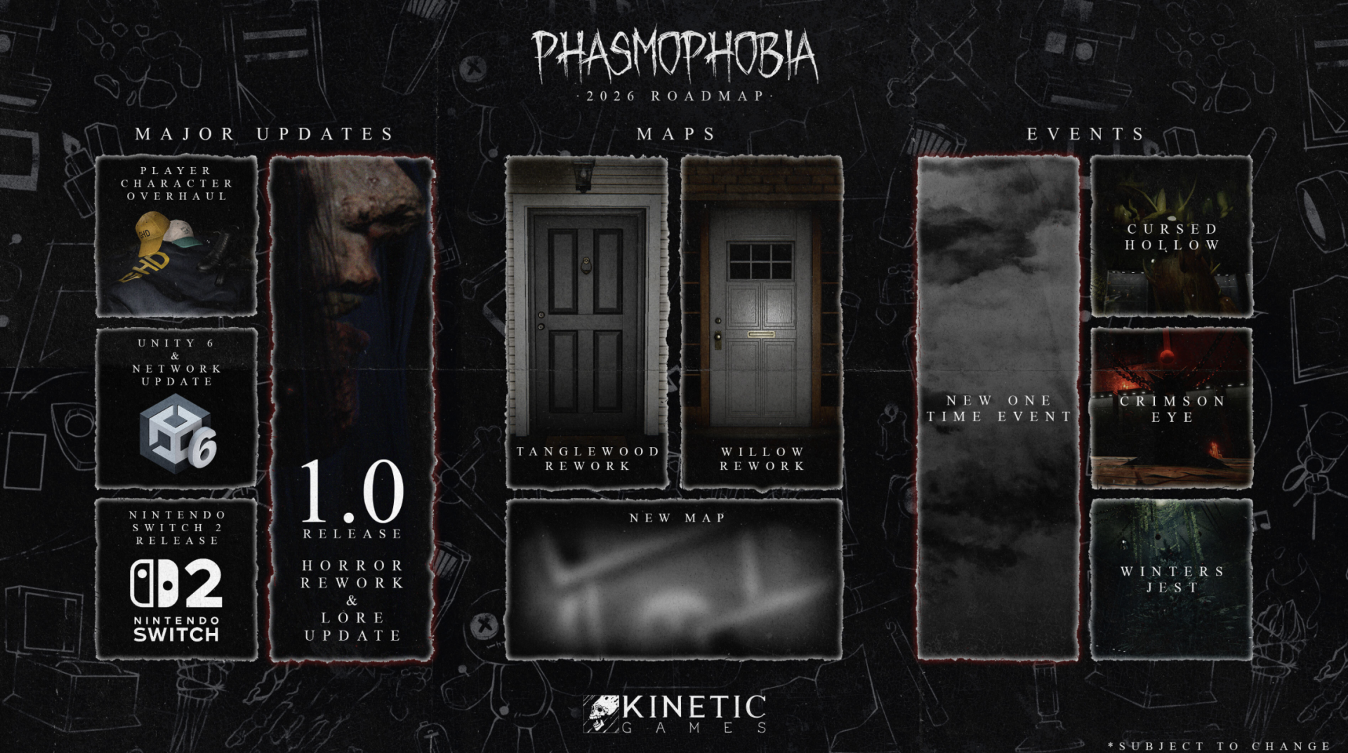 Вчера вечером, 31 января, разработчики хоррор-игры Phasmophobia опубликовали дорожную карту на ближайшие обновления. На ней они поделились не только будущими масштабными обновлениями, но и интересными событиями. Давайте взглянем, что же ожидает нас в этом году.