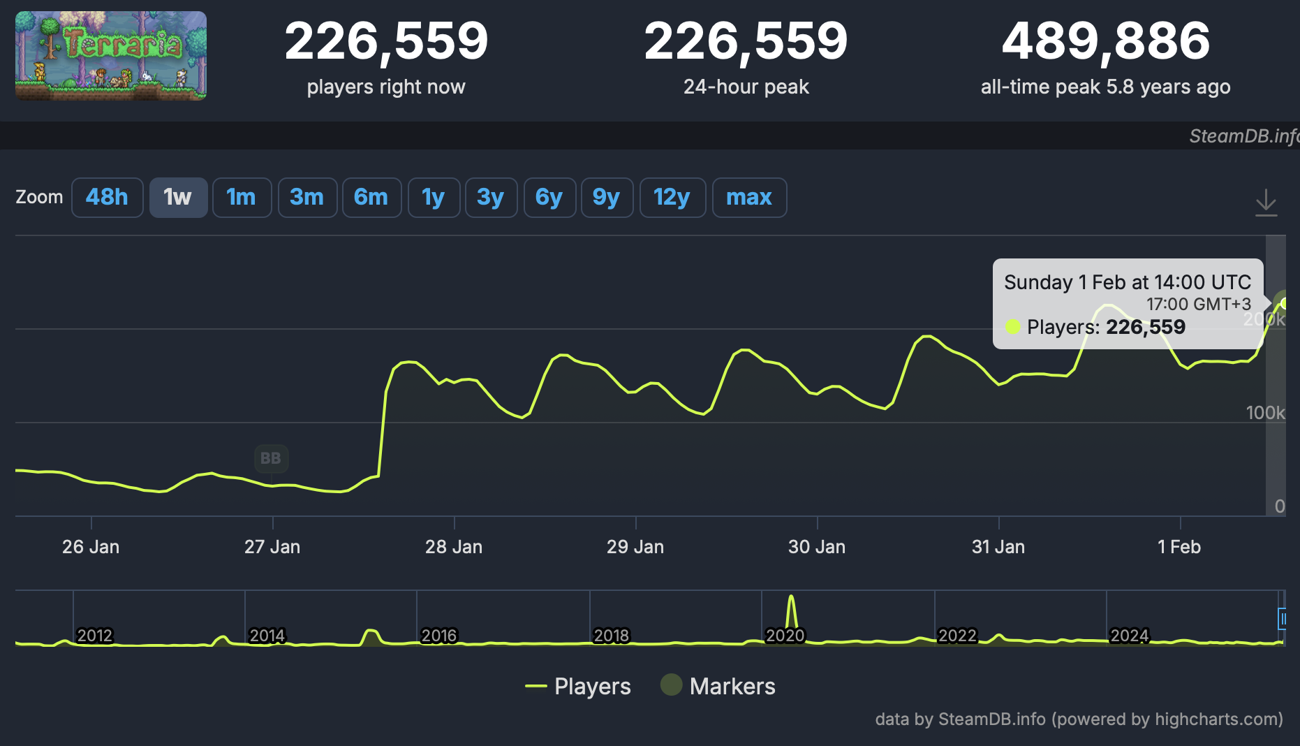 Сегодня, 1 февраля, в Terraria зафиксирован рекордный показатель — 226.559 пользователей онлайн. Таких цифр не наблюдалось с мая 2020 года, когда вышло предыдущее крупное обновление. Для сравнения, рекордный показатель был зафиксирован в октябре 2022 года — тогда онлайн превысил 115.000 пользователей.