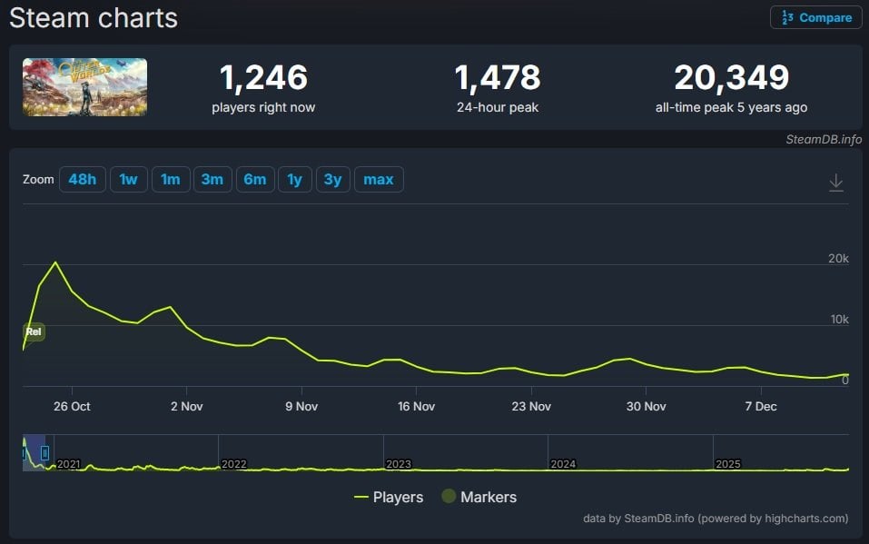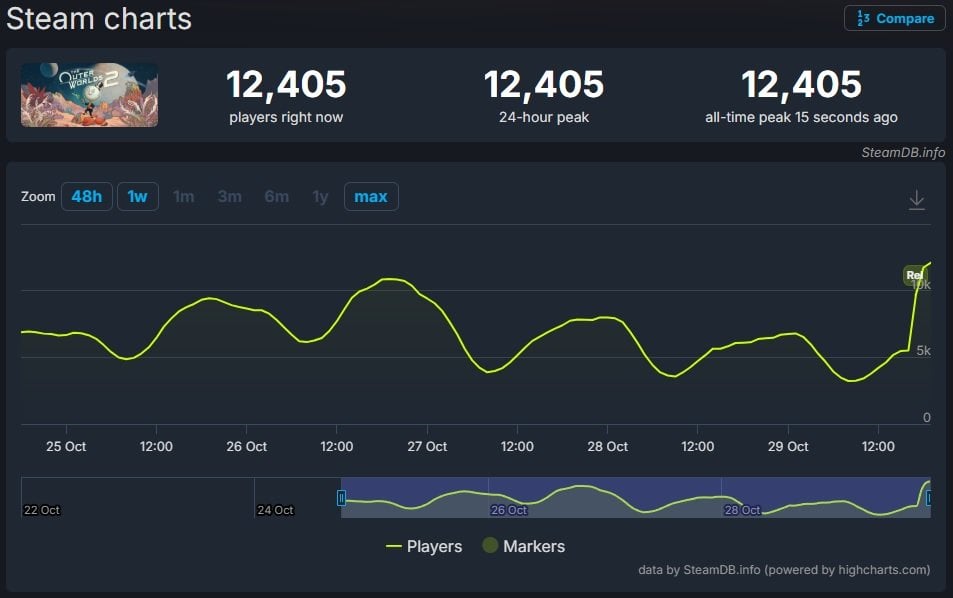 Вчера, 29 октября, студия Obsidian выпустила стандартное издание ролевого экшена The Outer Worlds 2 (владельцы расширенного издания начали играть еще на три дня раньше). Иии... чуда не случилось. Пиковый онлайн новинки с трудом перевалил за 12 тысяч человек, в то время как оригинальная игра 2020 года может похвастаться пиком в 20 тысяч человек.