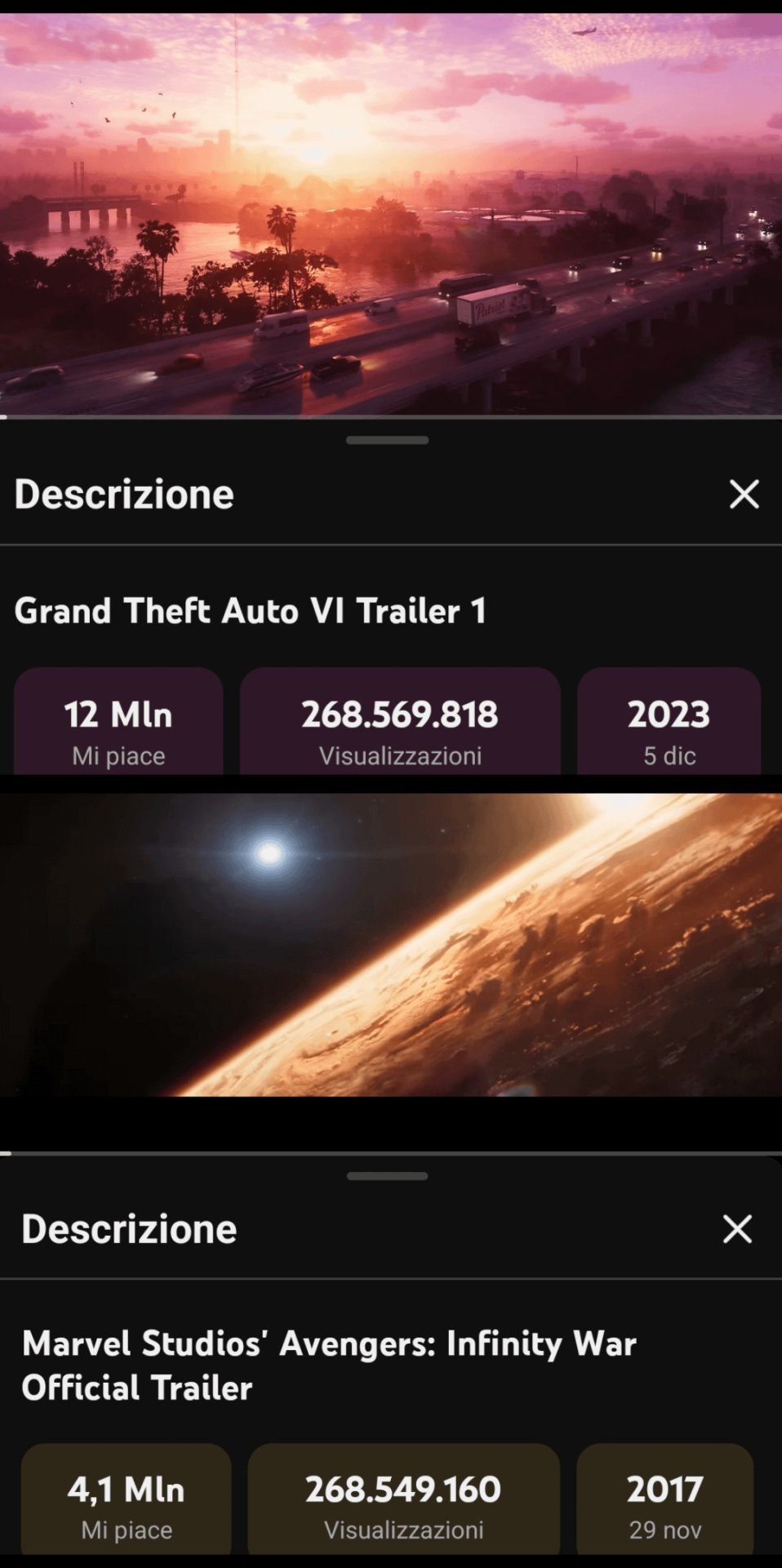 Кроме этого, первый трейлер, вышедший 5 декабря 2023 года, теперь стал самым просматриваемым трейлером в истории YouTube — у него уже 268,6 млн просмотров, 12 млн лайков и почти 250 тысяч дизлайков. Он даже обошел рекорд «Мстителей: Война бесконечности».
