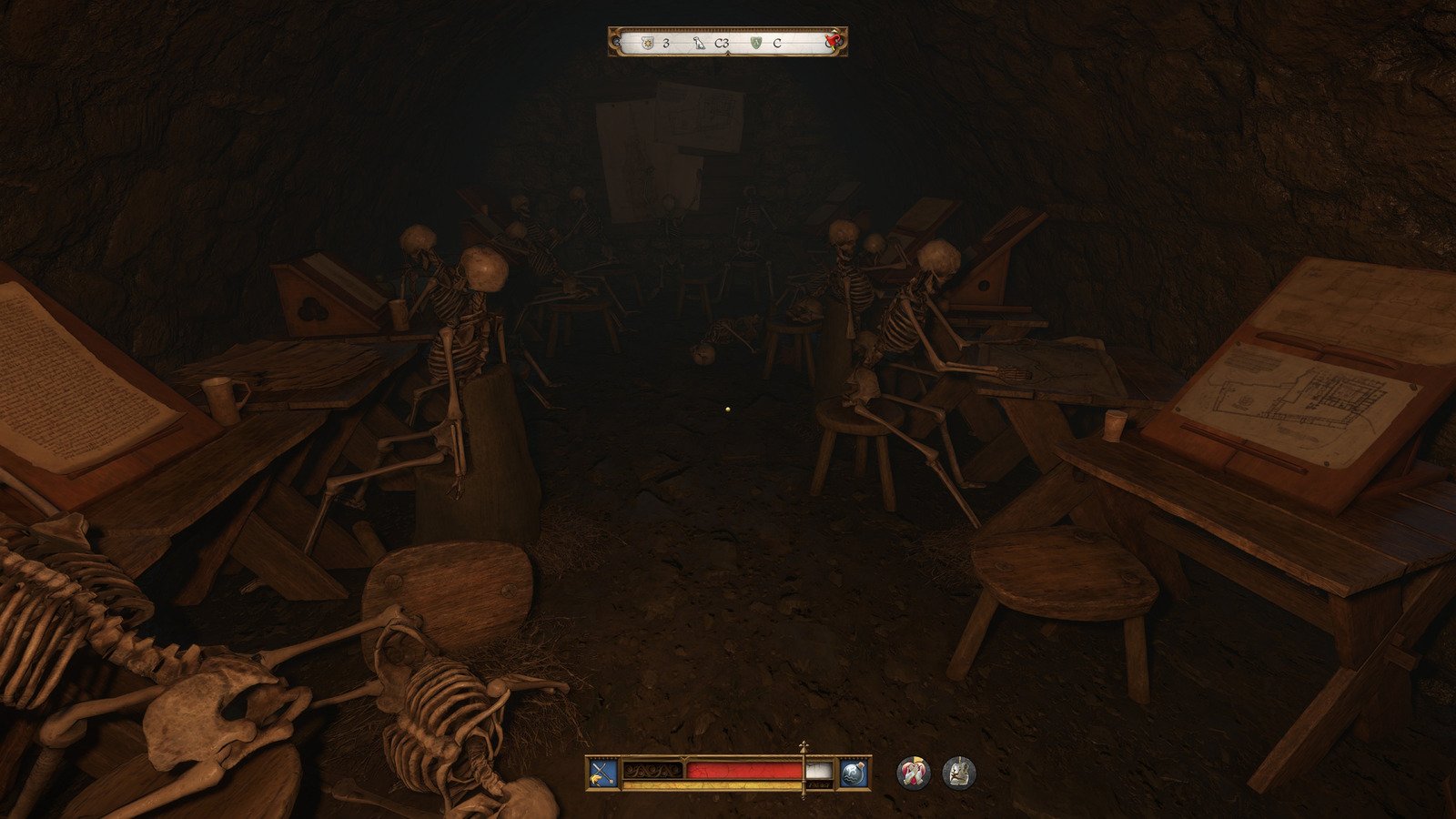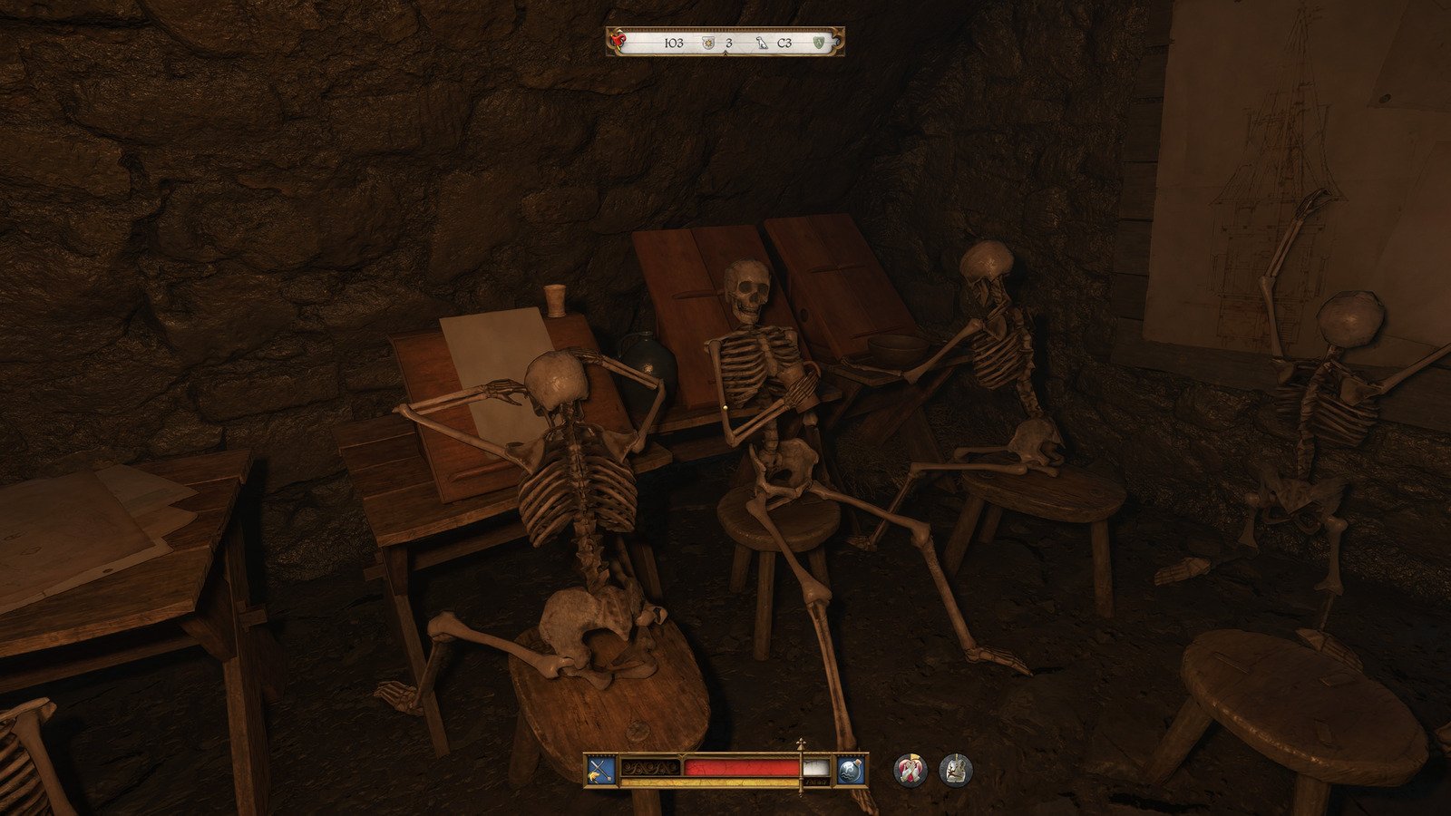 Дойдя до отмеченной на карте точки, вы увидите куст, а внутри него — каменную лестницу. Пройдя по ней, вы попадете в комнату, которая полна скелетов, занимающихся творческой деятельностью.