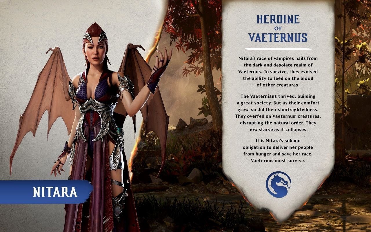 В предыдущих частях файтинга Нитара боролась за свободу своего народа. Однако биография вампирши, как и большинства других персонажей, претерпела значительные изменения в грядущей Mortal Kombat 1.