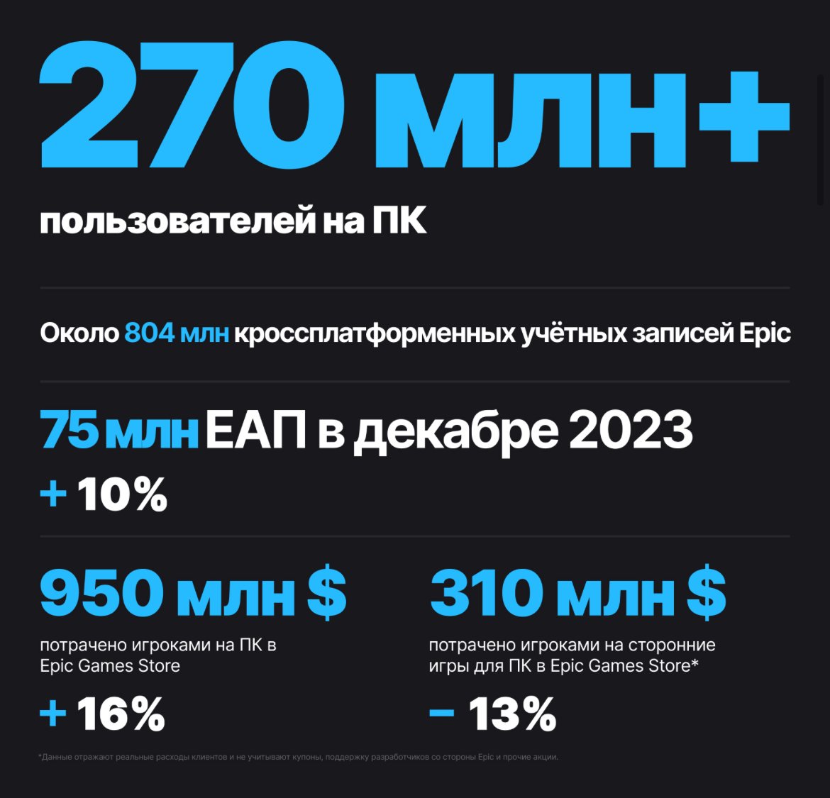 16 февраля Epic Games решила подвести итоги 2023 года для своего цифрового магазина. EGS значительно вырос: количество ПК-пользователей увеличилось на 40 млн, добавилось 1300 новых игр и приложений.
