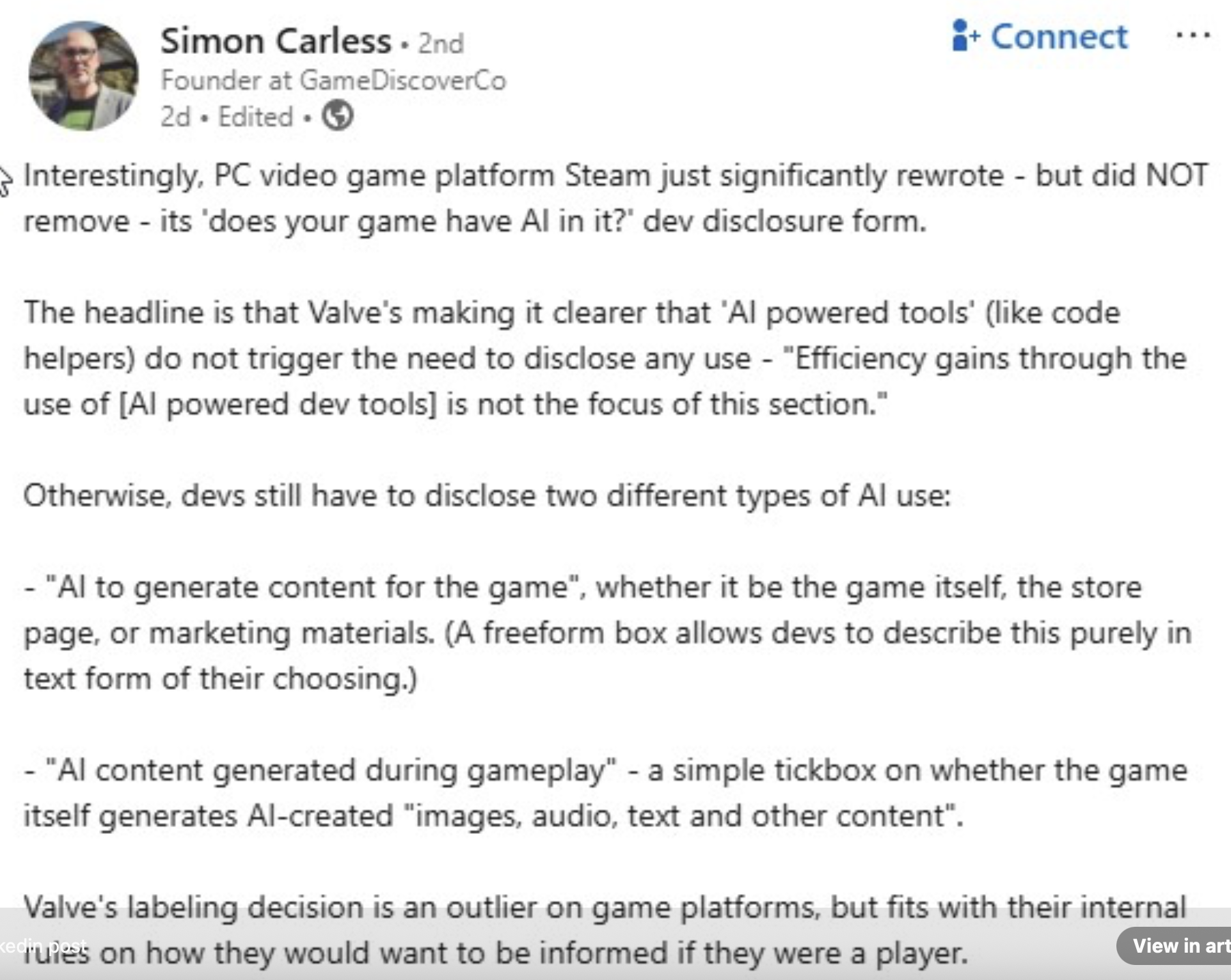 Согласно новым правилам компании, отныне разработчики обязаны раскрывать информацию об ИИ только в случаях, когда он напрямую влияет на конечный продукт — сгенерированный внутриигровой контент в виде ассетов, текста или 3D-моделей.