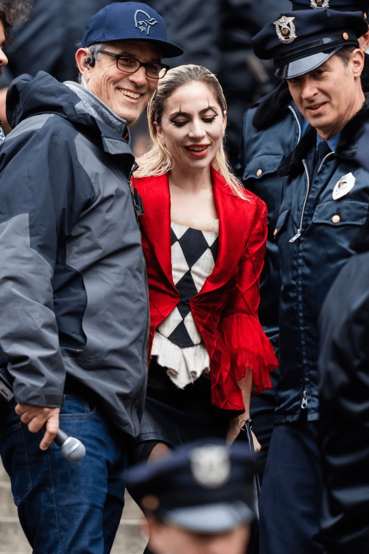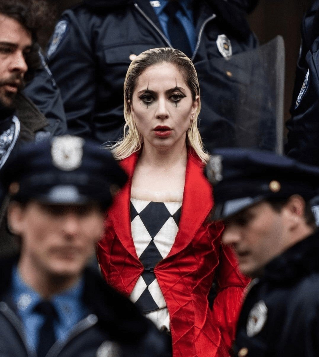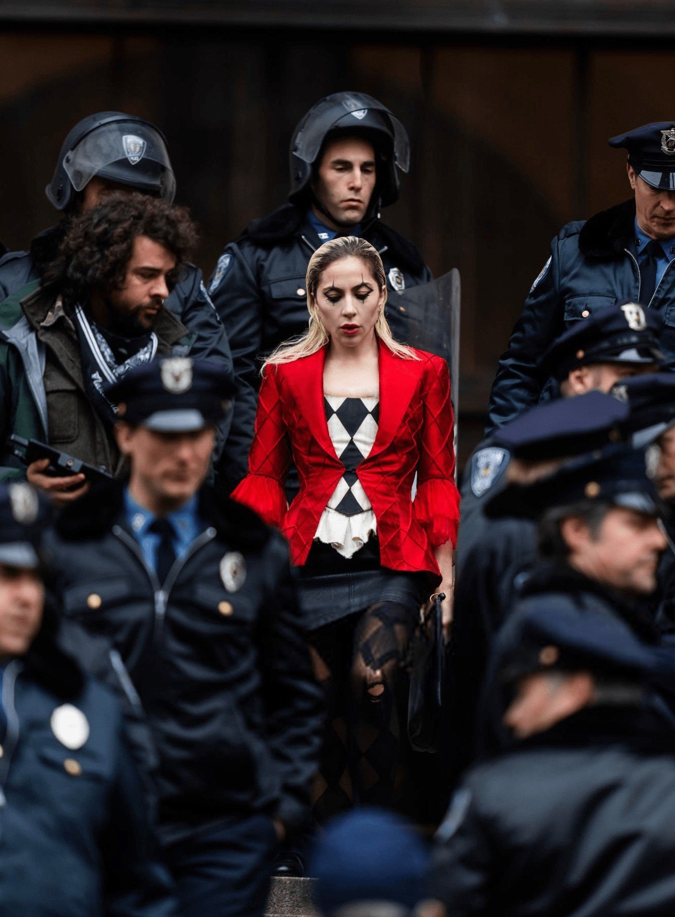 На снимках можно увидеть певицу Леди Гагу в роли безумной соратницы Джокера, окруженную сотрудниками полиции. Актриса одета в красный пиджак и бело-черную блузку с узором, которые намекают на образ арлекина.