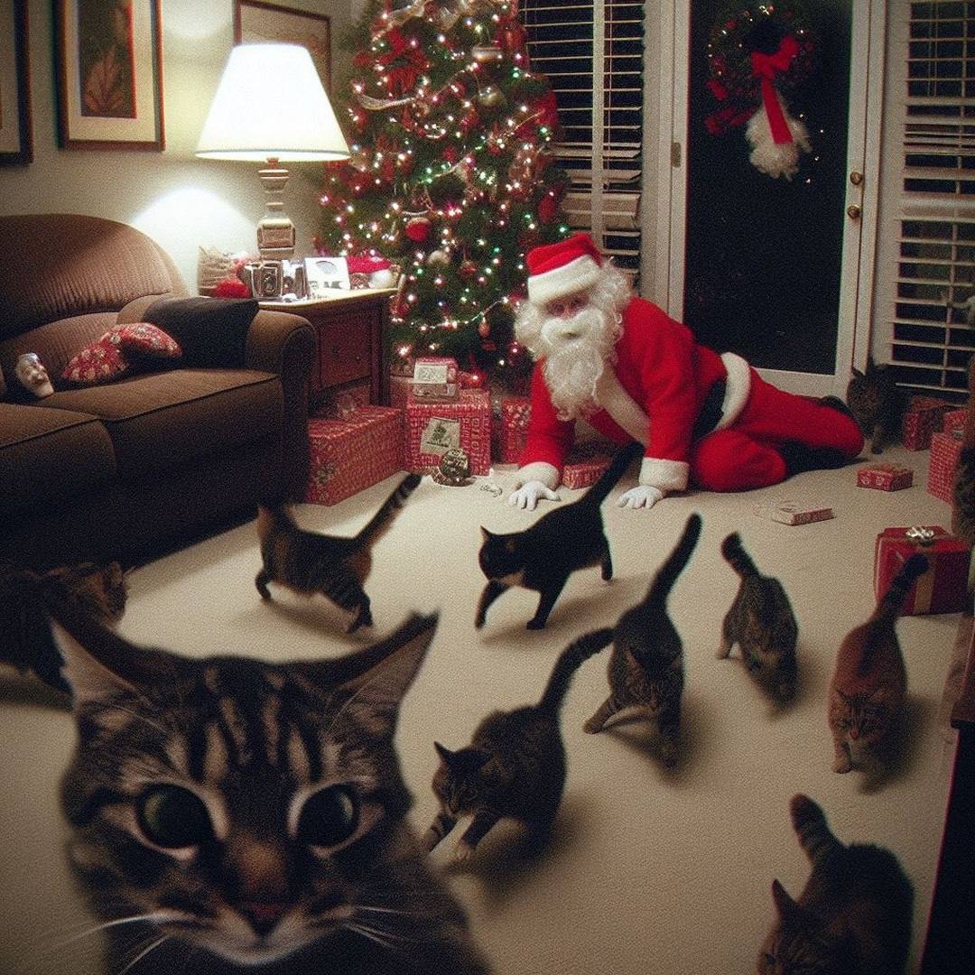 В одной из квартир Санта Клаусу пришлось присмотреть за кошками. Правда, у него это не особо получилось — пушистые друзья успели разбежаться.