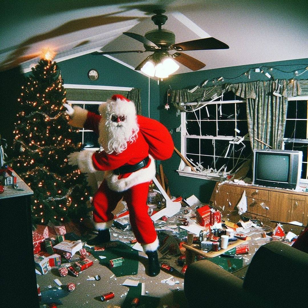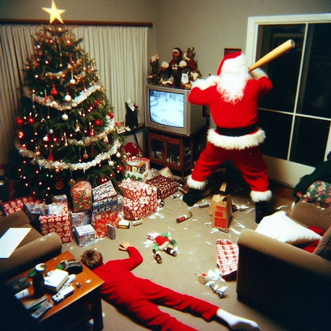 А на этой картинке видно, что беспорядок — точно дело рук Санты. Он схватил биту и готов ударить ей по стеклу. Ребенок в это время лежит на полу.