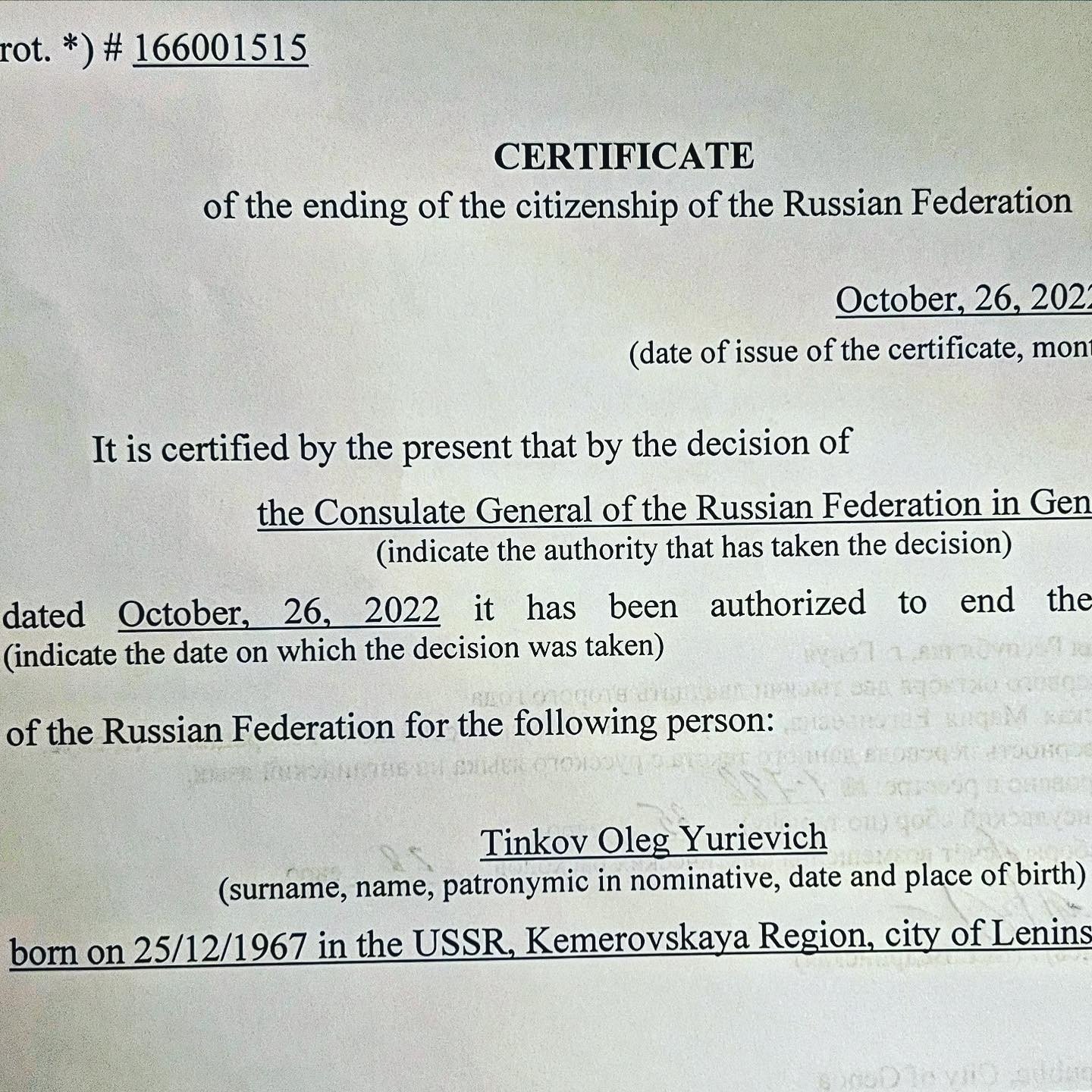 Основатель «Тинькофф Банка» Олег Тиньков отказался от гражданства РФ. Об этом предприниматель сообщил в личных соцсетях, приложив фото документа, подтверждающего, что его прошение о выходе из российского гражданства удовлетворено.