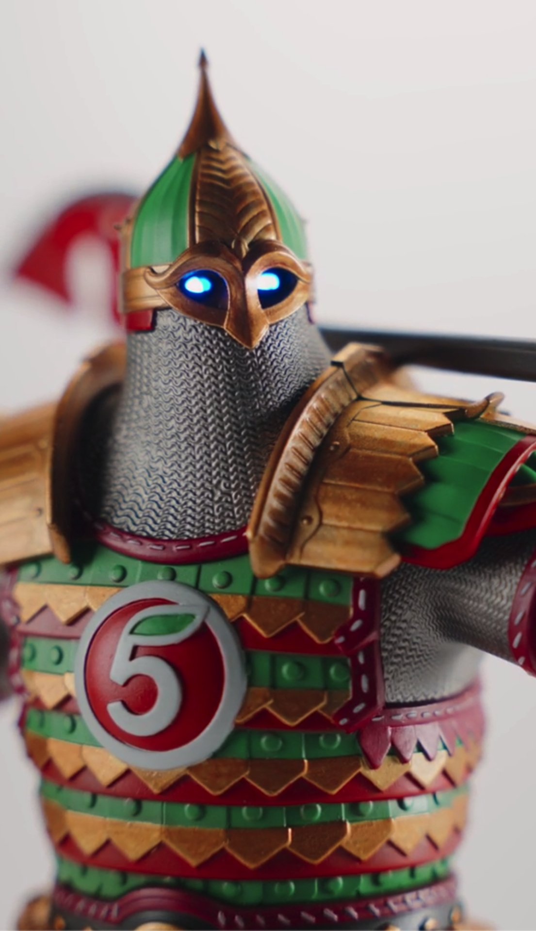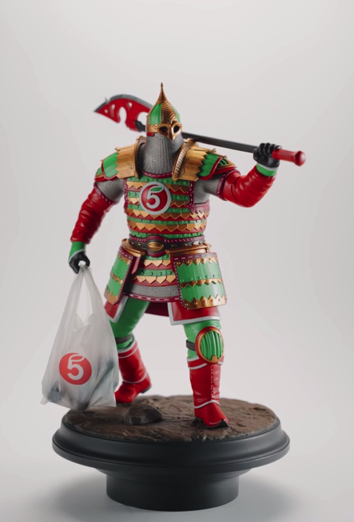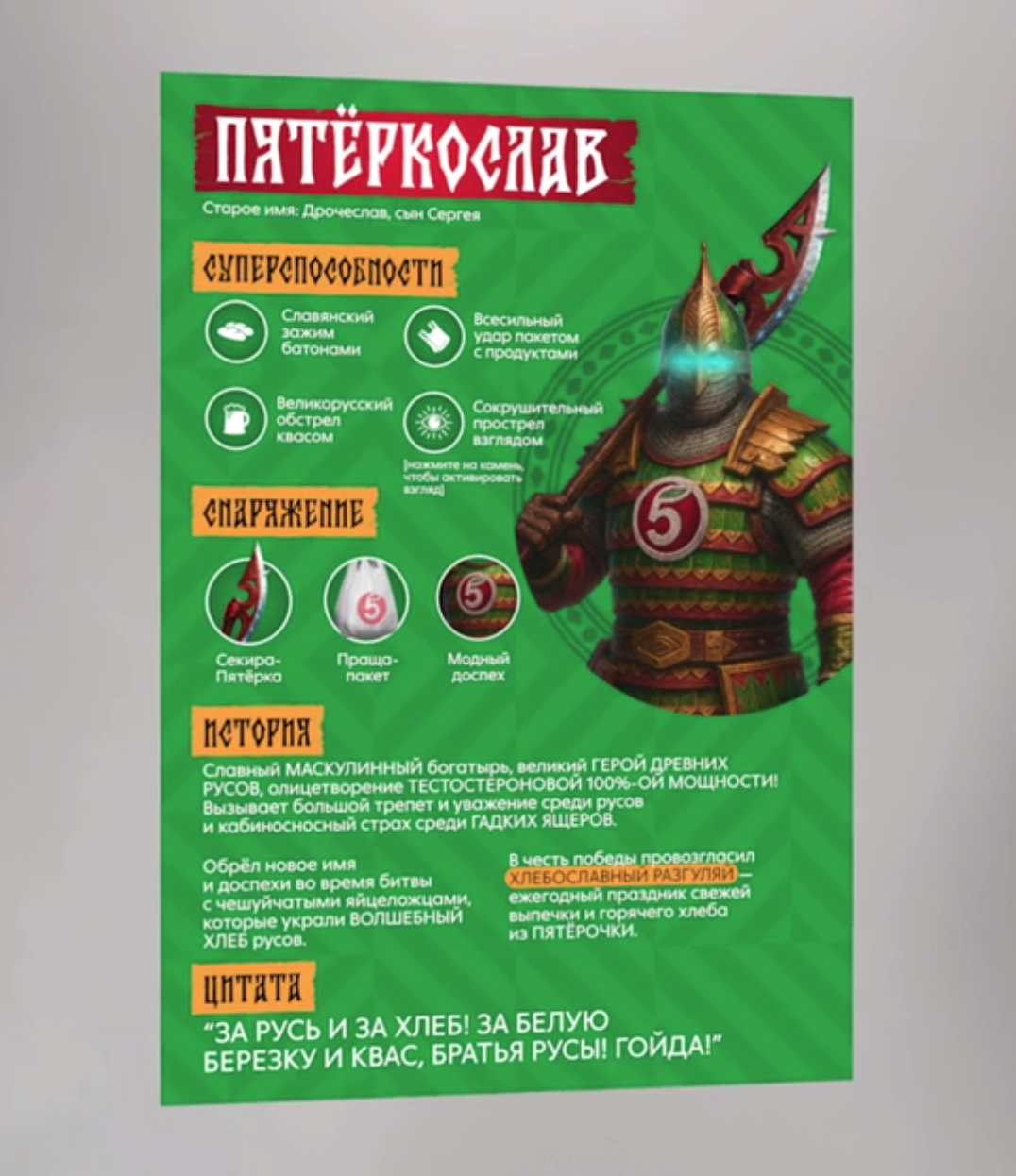 Торговая сеть «Пятерочка» совместно с мемной игрой «Русы против ящеров» представила лимитированные промо-предметы — хлебницу и фигурку ящера-богатыря Пятеркослава со светящимися глазами.