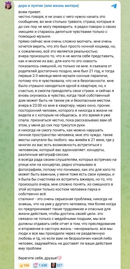 Я никогда не смогу понять, как можно нарушать личное пространство человека, мне это чуждо. Такие жесты напугали бы любого. Мы живём в 21 веке, где у многих из вас есть возможность встретиться с человеком, который вас вдохновляет: концерты, различные автограф-сессии. Я всегда рада своим слушателям, которых встречаю на улице или на концертах, редко отказываю в фотографиях, потому что понимаю, как это для кого-то может быть важным, у меня тоже есть свои кумиры, и я была бы счастлива их встретить вживую, но то, что произошло вчера, мне сложно понять. Из смешного в этой истории только костюм человека-паука и, собственно, всё. Сталкинг — это очень серьезная проблема, никогда не знаешь, что на уме у другого человека, тем более когда он предпринимает такие трудоемкие и опасные для жизни действия, чтобы достичь своей цели. Это связано не только с медийными людьми, мы все должны отдавать себе отчет в том, что преследование и вторжение в частную жизнь — ненормально. Все мы люди, и все мы проходили через неразделенную любовь и т. д., но если вам небезразличен какой-либо человек, задумайтесь, не доставят ли ваши действия ему проблем. Берегите себя, друзья!