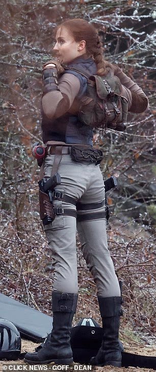 Для сцен Софи сменила классические шорты Лары Крофт на более практичные серые карго-брюки, дополнив образ коричневым топом, жилетом, кобурами и фирменной косой героини.