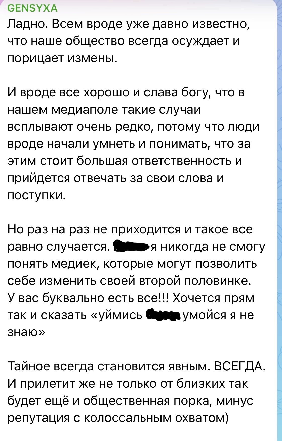 Измены случаются даже в крепких парах. И, к сожалению, от этого не застрахован никто — даже медийные личности. После новостей об измене стримера Шаха EverybodySOSA своей бывшей девушке Юле, Генсуха выложила на своей странице в телеграм пост любопытного содержания.