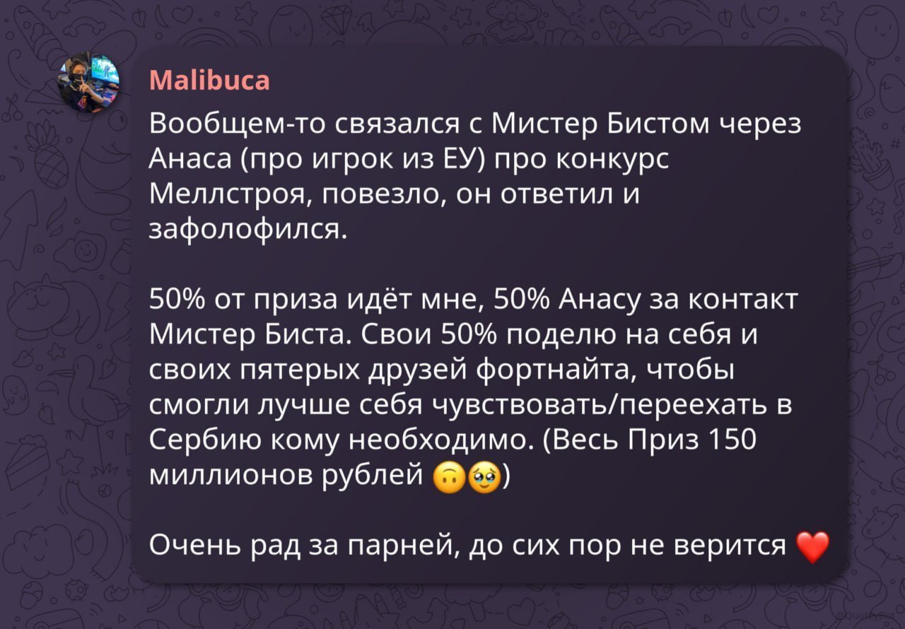 В итоге приз в размере 150 млн рублей ребята решили разделить пополам. Часть своего выигрыша Malibuca планирует разделить между своими друзьями, которые хотят переехать в Сербию.