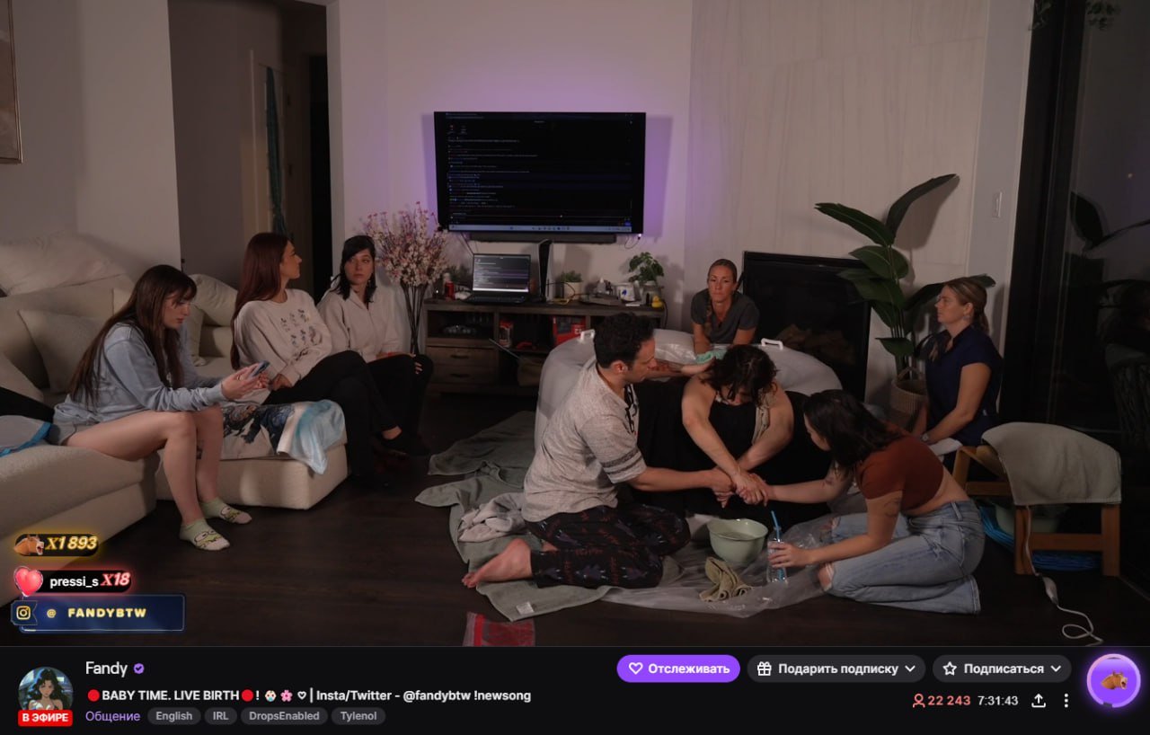 Эфир зарубежной стримерши под ником Fandy длился около девяти часов, но лишь под конец активность на нем активно выросла — к моменту родов на трансляции было около 30 тысяч зрителей. Девушка родила дочку, которую назвали Луна Фандих.