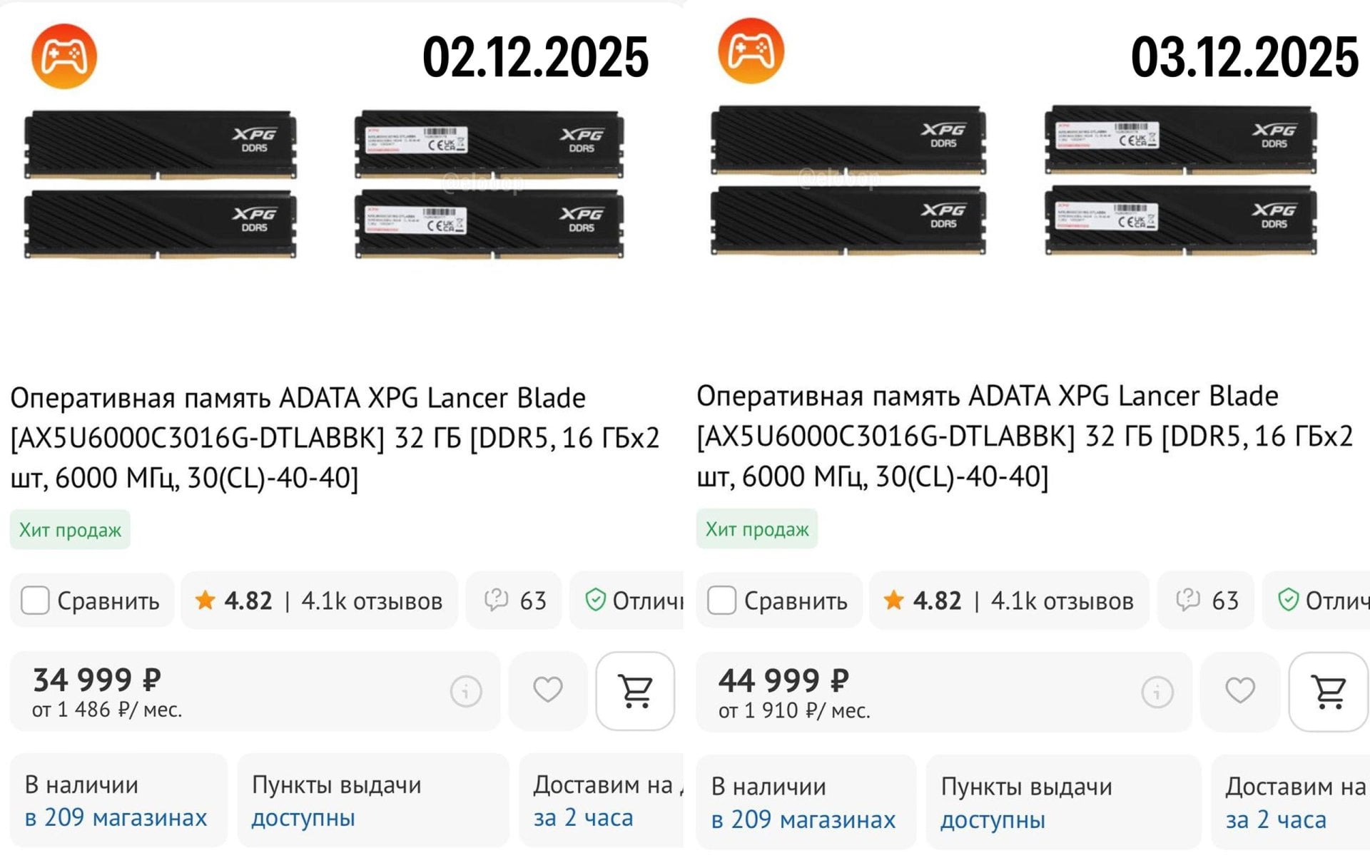 Например, ADATA XPG Lancer Blade RGB 32 ГБ, который ещё в конце ноября можно было купить почти в два раза дешевле, за считанные недели подскочил до рекордных значений. В ноябре рост только начинался, но к декабрю ситуация буквально вышла из-под контроля.