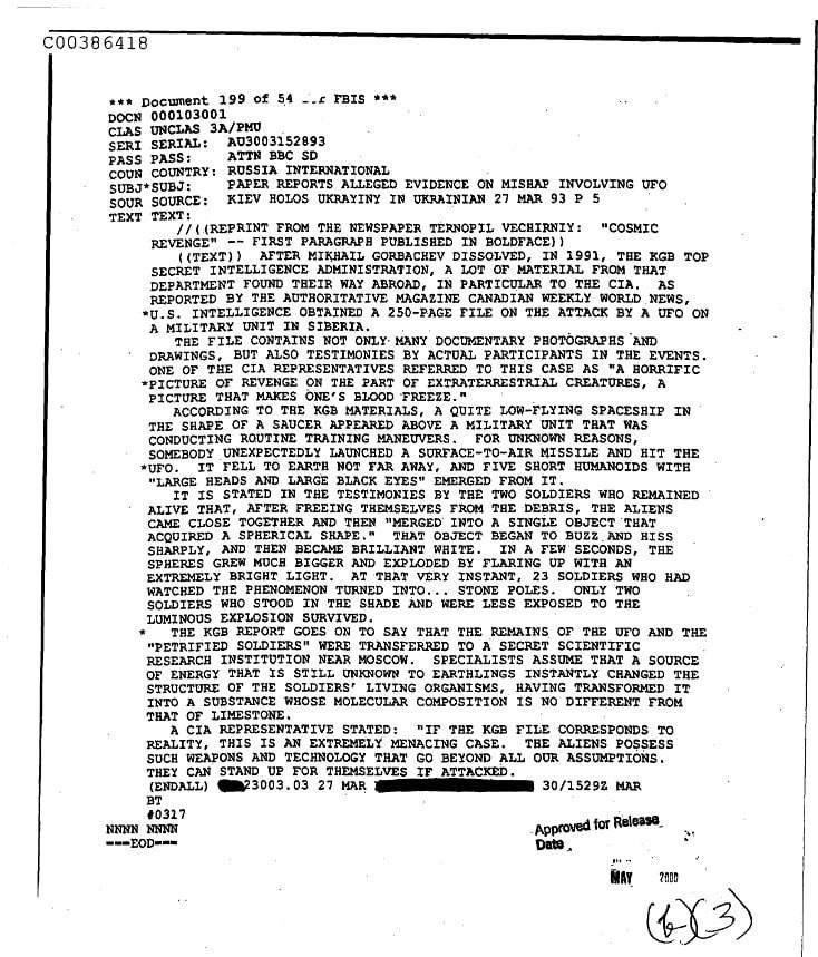 В документе указано, что между 1989 и 1990 годом над сибирской военной базой пролетело НЛО в форме тарелки. Наши военные сбили его ракетой «земля-воздух», однако на этом история не закончилась: